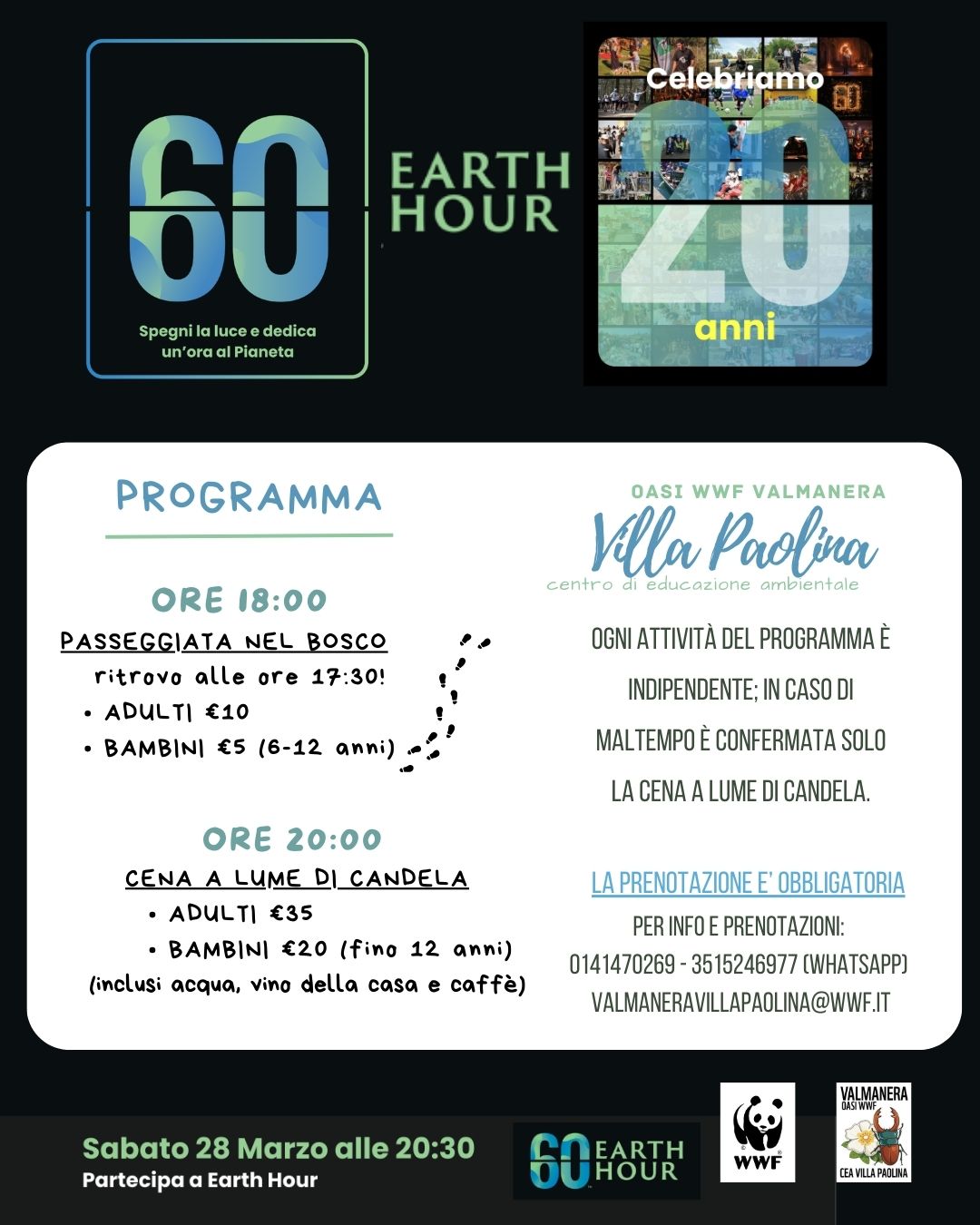 🕯️ Spegni la luce, accendi il Pianeta: Earth Hour a Villa Paolina! 🌍 Sabato 28 Marzo, unitevi a milioni di persone in tutto il mondo per l’Ora della Terra. All’Oasi WWF Valmanera, dedichiamo un’intera serata alla bellezza della natura e alla consapevolezza energetica. Un piccolo gesto per un grande cambiamento! 🌿✨ In questa serata speciale, […]
